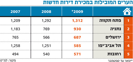 עוד על פי הנתונים: תל אביב נמצאת רק במקום הרביעי, ואת המקום החמישי תפסה רחובות. בפתח תקווה, שממוקמת בראש הטבלה, נמכרו בינואר־ספטמבר 1,312 דירות חדשות לעומת 1,292 בכל 2008. בנתניה, שנמצאת במקום השני, נמכרו 930 דירות חדשות לעומת 769 ב־2008, ובירושלים, שהגיעה למקום השלישי, נמכרו 687 דירות חדשות בשלושת הרבעונים הראשונים של 2009, לעומת 566 בכל 2008.