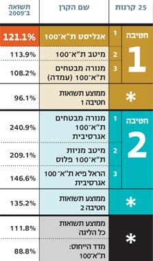 המנצחת של הליגה היא אנליסט ת"א 100, שעלתה ב־2009 ב־121.1%. ב־2008 ירדה הקרן ב־62%, ומתחילת 2008 רשמה הקרן תשואה שלילית של 16.1%. אחריה נמצאת מיטב ת"א 100 שעלתה אשתקד בכ־114%, ואולם מאחר שב־2008 ירדה הקרן ב־61%, הרי שגם במקרה זה התשואה מ־2008 היא שלילית ומסתכמת ב־16.8%. את החטיבה השנייה מובילה מנורה מבטחים ת"א 100 אגרסיבית, לאחר שב־2009 היא עלתה בכ־241%. ב־2008 ירדה הקרן ב־81.6%, ולכן התשואה המצטברת מתחילת 2008 היא שלילית, ומסתכמת ב־37.4%.