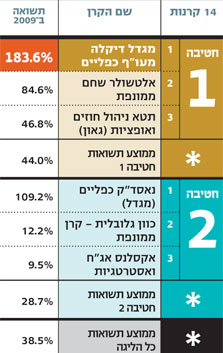 קרנות שהיו במקומות נידחים בשנת 2008 נהפכו לכוכבות הגדולות של 2009, וייצרו למשקיעים בהן תשואה חלומית. בין הקרנות שהובילו את המגמה, וכבשו את פסגת ליגת האלופות של "כלכליסט" ו-IFO: רמקו נדל"ן ותשתיות שזינקה ב-200%, מגדל דקלה מעו"ף כפליים - 184% וכלל מעו"ף בריבוע - 183%
