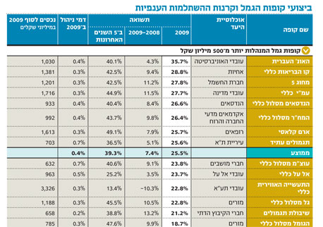 קופות הגמל הענפיות השיגו ב־2009 תשואה ממוצעת של 25.55%, נמוכה בהרבה מהתשואה שהשיגו קופות הגמל הפרטיות, המנוהלות על ידי בתי השקעות וחברות הביטוח (31.4% בקופות הגדולות ו־33.9% בקופות הבינוניות), כך עולה מבדיקת "כלכליסט". בחודש דצמבר רשמו הקופות הענפיות הגדולות תשואה ממוצעת של 0.22%.