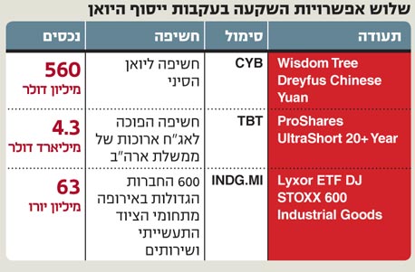 אנו ממליצים להיחשף ליואן הסיני באמצעות תעודת הסל Wisdom Tree Dreyfus Chinese Yuan (CYB). התעודה עוקבת אחר שער היואן מול הדולר, כאשר רוב הנכסים מושקעים באג"ח ממשלתיות ובחוזים עתידיים על היואן.