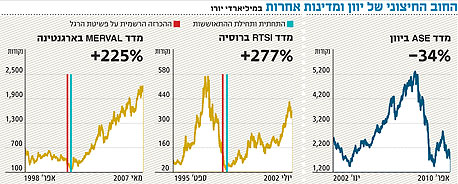 המקרים של ארגנטינה ורוסיה מלמדים שכ־80% ממהלך הירידה בשוקי המניות של מדינות פושטות רגל מתבצעים לפני ההכרזה הרשמית. זמן קצר אחר כך מגיעה התחתית ולאחריה ההתאוששות. המשבר היווני כהזדמנות השקעה