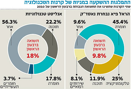 נפתח עם ניתוח של שתי קרנות ההייטק הישראליות המשקיעות בחברות הנסחרות בנאסד"ק: הראל פיא נבחרת נאסד"ק ואקסלנס נאסד"ק. הקרן מבית הראל רשמה ברבעון הראשון של השנה תשואה של 9.8%, לעומת הקרן של אקסלנס שהשיגה תשואה רבעונית של 2.4% בלבד.
