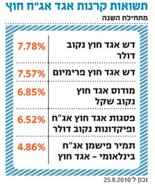בשוק הישראלי פועלות תשע קרנות מסוג אגד אג"ח חוץ, ושלוש מתוכן מנהלות סכומים הנמוכים מ־5 מיליון שקל. שתי קרנות החלו לפעול רק מתחילת השנה, בהן אגד אג"ח החוץ של הראל פיא ושל פסגות. נתייחס כאן לששת אגדי קרנות החוץ העיקריים, המנהלים סכום כולל של כ־1.2 מיליארד שקל. בדיקת ביצועי הקרנות נעשתה תוך התייחסות לדירוג הכוכבים של Morningstar.