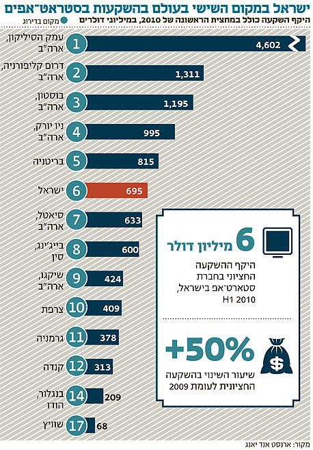 למרות התארכות זמן ההמתנה לאקזיט ולירידה בהשקעה החציונית בסטארט-אפים, מיקומה של ישראל ביחס לאזורי השקעה מרכזיים בעולם דווקא עלה: במחצית הראשונה של 2010 מדורגות ההשקעות בהייטק הישראלי, העומדות על כ־700 מיליון דולר, במקום השישי בעולם, אחרי אזור ניו יורק ובריטניה ולפני סיאטל ובייג'ינג. זהו שיפור ביחס לדירוג ישראל ב־2009, אז היתה במקום השמיני.