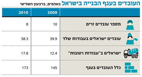 בין 2008 ל־2011 מקטינה הממשלה את מכסת העובדים הזרים בבניין ב־2,000 מדי שנה, ובעוד שב־2008 היה מספרם 12 אלף, השנה יש אישור להעסקת 6,000 עובדים זרים בענף. ב־2005 היה מספרם 20 אלף. במקביל, לפי נתוני הלמ"ס, מספר הישראלים העוסקים בעבודות הבנייה (בנאים, רצפים וברזלנים, טייחים, טפסנים) עמד בסוף הרבעון השלישי של 2010 על 38.3 אלף, לעומת 39.9 אלף ברבעון השלישי של 2009. ברבעון השני של 2010 עמד מספרם של עובדים אלה על 44.5 אלף.