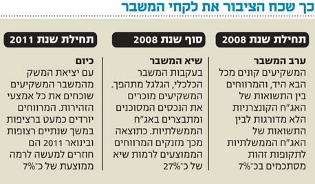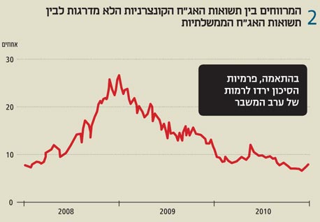 מאז אותו דיון של הנהלת בנק ישראל הלך המצב והורע. מנתונים שפרסם בנק ישראל בדו"ח האינפלציה האחרון, לפני שלושה שבועות, מתברר כי לאחרונה חזרו מרווחי האג"ח הקונצרניות ללא כל דירוג לרמתם בתחילת שנת 2008, לפני המשבר הכלכלי.