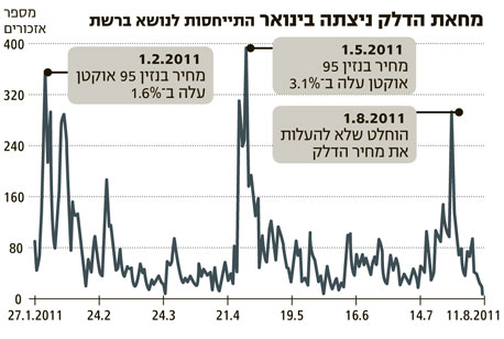 גם חברת buzzilla, סטארט-אפ ישראלי שעוסק בין השאר בניטור אזכורים של מילים ברשת עבור מפרסמים, גילה מגמה דומה. המנכ"ל יואב פרידור טוען ש"אם בודקים אזכורי מילים במחאות כגון אלה של מחירי הדלק, הלחם והמים, אפשר לראות את ניצני המחאה כבר בחודשים ינואר ופברואר". מבט בנתונים שמספקת buzzilla מראה כי הגורם המרכזי לעליית גל המחאה בסוף ינואר היה אז עליית מחירי בנזין אוקטן 95 ב-1.5% ל-7.26 שקל לליטר.