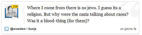 הציוצים הבאים נכתבו ברוח דומה. "בגרמניה הנאצית היהודים היו צריכים לתפור כוכבים (הטלאי הצהוב) על הבגדים. אילו לא היו עושים זאת, הגרמנים לא היו יכולים לדעת מי יהודי ומי לא. במקום שאני מגיעה ממנו אין יהודים, ואני מניחה שזאת דת. אז למה הנאצים מדברים על גזעים?".