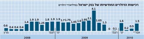 מתחילת ההתערבות המחודשת שלו במסחר במטבע חוץ במרץ 2008 רכש בנק ישראל כמות מצטברת של כ־33 מיליארד דולר - כלומר יותר מ־120 מיליארד שקל. מדובר בערך בסכום השווה לפעם וחצי התקציב השנתי של משרדי הביטחון והחינוך גם יחד. היתרות העצומות חושפות את הבנק לסיכוני שער חליפין גדולים במיוחד. בנק ישראל אינו נוהג לבצע הגנות על יתרות המט"ח שלו, כי לדברי בכירים בבנק, "הגנות הן עסק למגזר העסקי ולא לבנקים מרכזיים".
