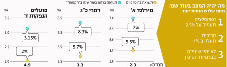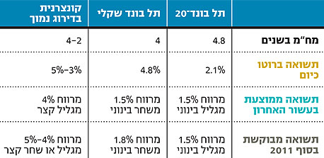 כדי להמחיש את הצפוי בשוק בעוד כשנה, כלומר בסוף 2011, עלינו להניח כמה הנחות. ראשית, נניח שקצב האינפלציה הצפוי בשנה הקרובה ינוע בטווח של 2.5%–3% (לשם החישוב נשתמש בנקודה התחתונה, 2.5%). שנית, נניח שריבית בנק ישראל תעלה ב־1% (כפי שהכריז הנגיד סטנלי פישר, ופחות מכפי שמניחים חלק מהחזאים).