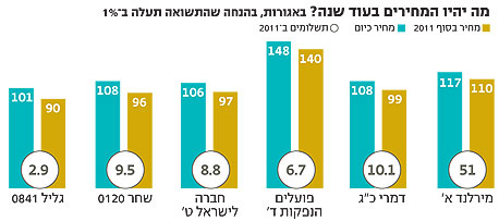 כעת בואו נשחק במשחק: נניח כי בעקבות עליית ריבית בנק ישראל ב־1% במהלך 2011, תחול זחילה כלפי למעלה גם בתשואות המבוקשות מהאג"ח. נניח כי התשואות שידרשו המשקיעים יעלו ב־1% לערך, בהתאם להעלאת הריבית. תחת ההנחה הזו, אפשר לראות בתרשים מהם המחירים הצפויים לסדרות האג"ח המייצגות את המדדים השונים.
