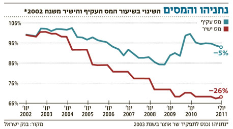את הצד הכספי של מה שקרה בתחום המסים בעשור האחרון, זה שאלמלא מהפכת האוהלים אמור היה ללוות אותנו גם בחמש השנים הבאות, מסבירים הנתונים שפורסמו לאחרונה בדו"ח השנתי של מינהל הכנסות המדינה: מתחילת הפעלתה ב־2003 ועד השנה, הקטינה הרפורמה במס הכנסה ליחידים ובמס החברות את הכנסות המדינה בסכום כולל של כמעט 30 מיליארד שקל. בצדה השני של התמונה ניצבים המסים העקיפים, שבעקבות שינויי החקיקה שיזם האוצר גדלה גבייתם בכ־7 מיליארד שקל.