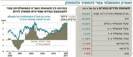 לפי יו"ר הפד בן ברננקי, הריבית בארה"ב צפויה להישאר ברמתה האפסית לפחות עד אמצע 2013 ואם החששות הגוברים להאטה ממשית בצמיחה העולמית יתממשו, נראה כי נגיד בנק ישראל סטנלי פישר ימשיך להוריד את הריבית בהתאם לעומק המשבר. במקרה כזה, המרווח בין תשואת האג"ח הישראליות לעשר שנים לזו האמריקאית צפוי להצטמצם ככל שייסגר פער הריביות בין המדינות.