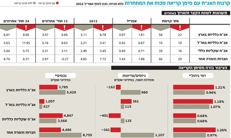 לעומת זאת, ב־12 החודשים החולפים, שכוללים, בין השאר, את המחצית השנייה של 2011 שבו רשמו האג"ח הקונצרניות ירידות שערים חדות, רשמו קרנות עם סימן קריאה תשואת חסר, עם עלייה בשיעור של כ־0.9%, לעומת עלייה של כ־3.6% בקרנות ללא סימן קריאה. ב־24 החודשים האחרונים חוזרת להוביל קבוצת קרנות אג"ח כללי עם סימן קריאה לאחר עלייה של כ־8.1% לעומת עלייה של כ־6.8% בקרנות ללא סימן קריאה.