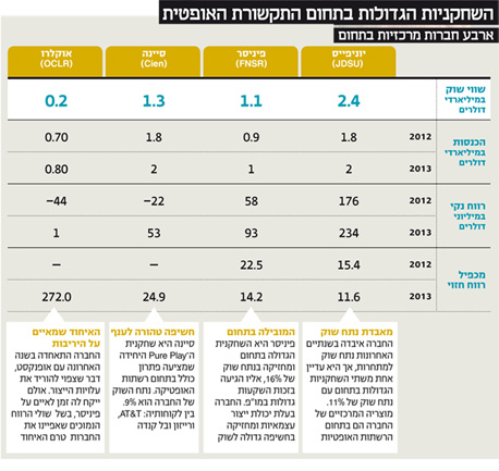 1. פיניסר (Finisar): החברה שמרכזה בקליפורניה היא הספקית הגדולה ביותר של רכיבים אופטיים בעולם, עם הכנסות של 953 מיליון דולר ב־2012 ונתח שוק של קרוב ל־16% ב־2011. היתרון הבולט של החברה הוא ביכולות הייצור העצמאיות שלה, בניגוד למתחרותיה שמתבססות על ייצור אצל קבלני משנה. לחברה חשיפה גדולה לשוק הסיני בזכות הלקוחה הגדולה שלה, חוואווי. פיניסר הצליחה להגיע לעמדה של מובילת שוק בזכות השקעות גדולות במחקר ופיתוח, וכן בזכות נתח שוק גדול בחלקים הרווחיים ביותר של השוק.