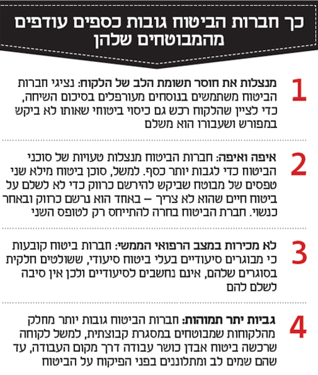 לרשום רווק כנשוי, להכניס עוד כיסוי ביטוחי בדלת האחורית בסיום השיחה ולאלץ מבוטחים לעבור מסלול מכשולים כדי לתקן טעויות שהם לא עשו. לחברות הביטוח יש שלל דרכים לא ראויות להוציא עוד כספים מהצרכנים. הרשימה החלקית לפניכם