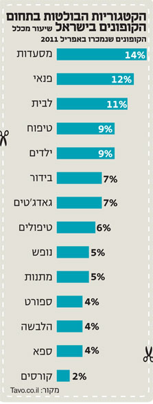 שוק הקופונים בישראל ממשיך לצמוח: מנתונים שאסף עבור "כלכליסט" אתר Tavo.co.il, הפועל כאגרגטור של אתרי הקופונים בישראל, עולה כי הכנסות שוק הקופונים הסתכמו בחודש אפריל ב־24 מיליון שקל, עלייה של 14% לעומת חודש מרץ. באתר Tavo מייחסים את עיקר העלייה בצריכת הקופונים לחיפוש אחר פעילויות לכל המשפחה במהלך חופשת הפסח.