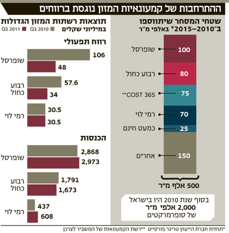 מבדיקה של חברת הייעוץ טריגר פורסייט עולה כי אם בסוף שנת 2010 היו בישראל כ־2 מיליון מ"ר של סופרמרקטים, הרי ששטחי המסחר צפויים לגדול ב־25% עד שנת 2015. הגידול צפוי בכל הרשתות החל מהגדולות שבהן, שופרסל וריבוע הכחול, ועד רשתות קטנות יותר כמו אושר עד ומחסני להב של חברת דן.