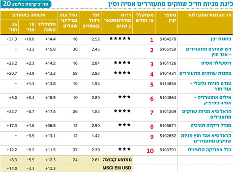 הקטגוריה סבלה בשלושת החודשים האחרונים מפדיונות של 41 מיליון שקל וכעת היא מנהלת 476 מיליון שקל. מבחינת המשקיעים ייתכן שמדובר בפספוס שכן למרות שהתשואה ב־18 החודשים האחרונים היא שלילית (-5.5%), מתחילת השנה הציגו הקרנות תשואה ממוצעת של 12.3% - בדומה למדד הייחוס MSCI EM.