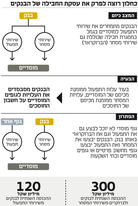 התקנות שעל הפרק מבקשות למנוע מגוף מוסדי לבצע את פעילות התפעול ואת פעילות הברוקראז' באותו בנק. הבנקים נוטים להישען על שירותי המסחר, שהם הרבה יותר רווחיים עבורם ומכניסים להם כ־300 מיליון שקל בשנה. סביר שהם יעדיפו להמשיך להעניק שירותי תפעול על פני שירותי מסחר.
