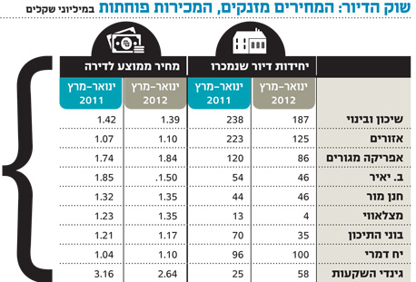 בשלושת החודשים הראשונים של שנת 2012 מכרו תשע חברות נדל"ן ציבוריות 687 יחידות דיור. המחיר הממוצע לדירה שנרכשה עמד על 1.3 מיליון שקל, עלייה של 4.8% לעומת התקופה המקבילה ב־2011