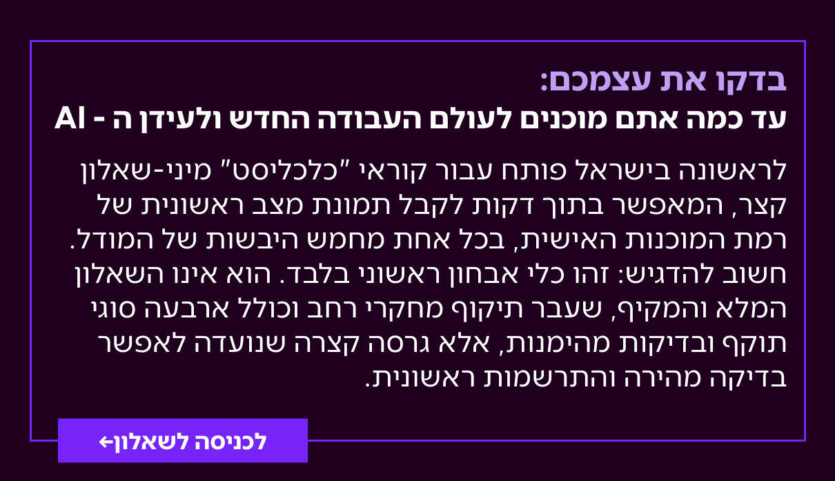 השאלון מצביע באילו יבשות קיימת מוכנות גבוהה, ובאילו נדרש להשקיע יותר זמן, מאמץ ולמידה ממוקדת. במציאות שבה ותק, טייטל וניסיון עבר כבר אינם מבטיחים ערך עתידי, זו אינה אבחנה תאורטית אלא נקודת פתיחה לבחירה מודעת. המדידה הופכת את מפת חמש היבשות לכלי עבודה שמאפשר לכל אחת ואחד לבנות במכוון את היתרון האנושי שלהם, ולהתקדם גם כאשר כללי עולם העבודה נכתבים מחדש.