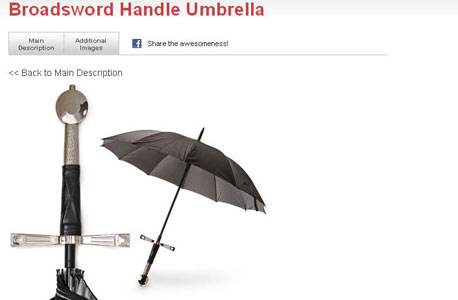 הנה מוצר מבריק ששווה להשקיע בו את תלושי הקנייה שקיבלתם מתנה לחג: מטריה המעוצבת כחרב אבירים מרגשת, כולל מנשא על הגב, לחידוד האפקט ולמניעת אובדן בעת עצירה בבית קפה. היא אמנם תעלה לכם 40 דולר, אך זהו מחיר זעום לשלם תמורת מבטי ההערצה של העוברים ושבים.