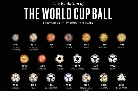 חלק משחקני המונדיאל כבר הספיקו להתלונן על הכדור החדש שאדידס ייצרה לכבוד המונדיאל בדרום אפריקה, במה שנראה כמו רוטינה קבועה בכל גביע עולמי. אבל חשבתם לרגע איך נראה הכדורגל הראשון ששימש במונדיאל? הניו יורק טיימס מציג בפניכם פרויקט יפהפה שמציג את האבולוציה של כדורי המונדיאל - מאורגווי 1930 ועד היום.