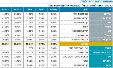 קרן ההשתלמות דש אקונומיסט מככבת בתשואה המצטברת לשלוש ולחמש השנים האחרונות, בפער ניכר מן המתחרות. דש אקונומיסט הגדילה בשנה החולפת את רכיב המניות בתיק שלה ב־35% לרמה של 30.2%, וזאת על חשבון שיעור המזומנים והאג"ח הקונצרניות. שיעור המזומנים בתיק ירד מרמה של 23.9% באוגוסט אשתקד לרמה של 4.6% בלבד בסוף יולי. הקופה אף הגדילה מהותית את רמת החשיפה שלה לשוקי חו"ל, מרמה של 8.1% באוגוסט אשתקד ל־16.1% בסוף יולי, והניבה כתוצאה מכך תשואה של 9.36% בשנה האחרונה.