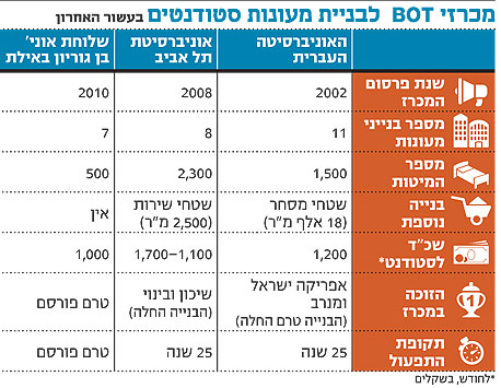 עו"ד גל אורן ממשרד עמית, פולק, מטלון ושות', שייעץ בעבר לחברת אפריקה ישראל במהלך המשא ומתן עם האוניברסיטה העברית, מסביר כי הבחירה בשיטת ה־BOT דווקא בבניית מעונות אינה מקרית: "זו שיטה נוחה לשני הצדדים: מצד אחד, האוניברסיטה אינה גוף העוסק בנדל"ן ואינה מעוניינת לקחת סיכון יזמי, להעמיד הון עצמי ולקחת הלוואה לצורך הקמת הבניין. מצד שני, ליזמים זוהי עסקה משתלמת, מכיוון שבדרך כלל נכסים אלה נמצאים במיקומים אטרקטיביים, וההסדר עם האוניברסיטה כולל הבנה שבחודשי הקיץ, כשהסטודנטים לא מתגוררים בקמפוס, אפשר להשכיר את הדירות לגורמים חיצוניים".