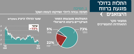 התאחדות התעשיינים מדדה את השפעת הירידה של הדולר על היצואנים במהלך השנה, ומצאה כי מחצית מהחברות דיווחו על פגיעה בכושר התחרות. נשיא ההתאחדות מצא את האשם: "שר האוצר רק מדבר בסיסמאות"