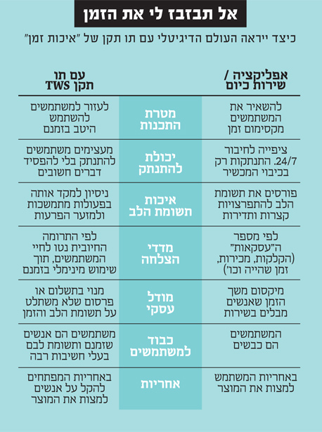 "אז בואי נניח שיש שתי אפליקציות מסרים. אחת כמו ווטסאפ, שמפריעה לאנשים גם כשהם לא רוצים שיפריעו להם, וגורמת להם להרגיש שהם חייבים לחזור למי שכתב להם. והיא גם יודעת, כמו פייסבוק, שאם היא לא תפריע לאנשים כל הזמן היא תהיה מצליחה פחות - ולכן אין לה תמריץ לעודד אנשים להתנתק ממנה. לעומתה, נניח שיש אפליקציית מסרים חדשה שהמפתחים שלה חושבים שלא טוב להפריע לאנשים כל הזמן ולעורר בהם את תחושת המחויבות הזו. אם המוצר שלהם יאפשר לאנשים להתנתק כשהם רוצים, אז ברור שהמתחרים שלהם יצליחו יותר, ובשביל זה הם יבקשו ממך דולר לשנה".