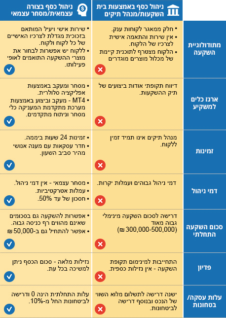 עיון מעמיק בהבדלים בין ניהול חשבון באמצעות מנהלי תיקים לבין ניהול חשבון מסחר עצמאי מעניק הסבר בהיר אודות תופעת המעבר המאסיבי של לקוחות לאפיק האחרון.