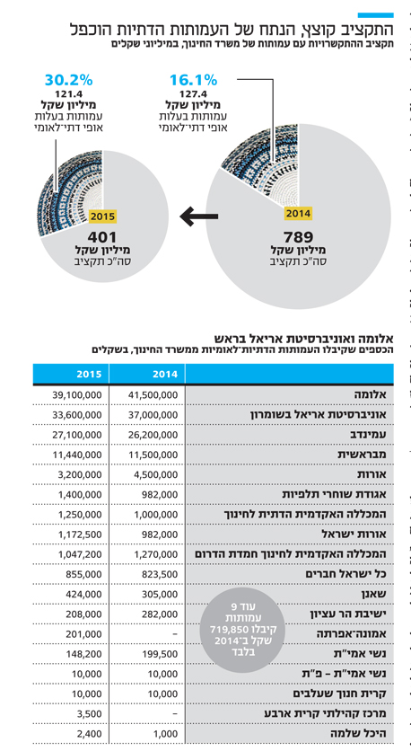 תקציב ההתקשרויות עם עמותות של משרד החינוך צומצם מ־789 מיליון שקל ב־2014 ל־401 מיליון שקל ב־2015, אבל זה לא פגע בסכומים שקיבלו מוסדות בעלי צביון דתי כמו אונ' אריאל בשומרון וישיבת הר עציון בגוש עציון מהמשרד בשנים האלה