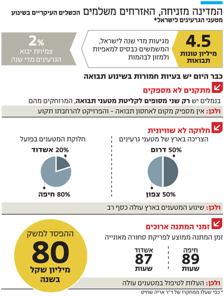 השורה התחתונה עגומה למדי. "העלות השנתית למשק כתוצאה ממחסור בתשתיות לשינוע גרעינים בנמלים מגיעה לכ־80 מיליון שקל לשנה", שיכלו, לדעת סחיש, להתגלגל גם לכיסו של האזרח. עוד הוא מוסיף ש"עלינו לזכור כי עומדת בפני מדינת ישראל תחזית תנועת מטענים של יותר מ־8 מיליון טונות ב־2030, היקף שמערך התשתיות הקיימות לא יוכל להעבירו כלל", כאשר לחץ ממשי כבד יצוץ כבר ב־2024.