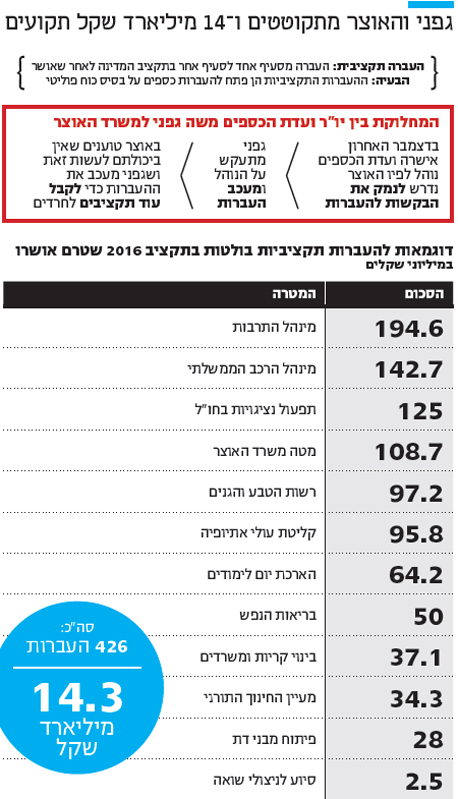 ריבלין ומערכת החינוך הנוצרית לא לבד. כמעט כל מנכ"לי המשרדים הממשלתיים מתקשרים בימים אלו שוב ושוב לוועדת הכספים ולאגף התקציבים במשרד האוצר בניסיון להבין מה קורה עם הכסף שהם אמורים לקבל. 14.3 מיליארד שקל ממתינים על שולחן אגף התקציבים שאנשיו יודעים שאין טעם להעבירם כבקשות להעברות תקציביות לוועדת הכספים כי גפני לא יקיים דיון על אישורן.