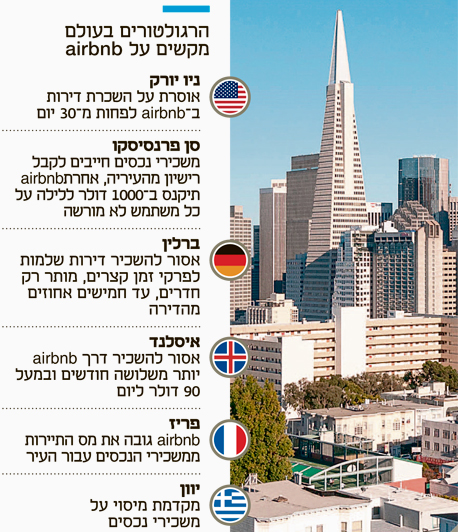השבועות האחרונים לא היו קלים עבור מנהלי airbnb: מלבד חקירת רשות המסים בישראל עומדת החברה מול שורה של מהלכים רגולטוריים אגרסיביים בכמה מהערים המרכזיות שבהן היא פועלת ברחבי העולם, שעלולים להרתיע משכירים ולפגוע בהכנסותיה בטווח הקצר ואולי אף לגרום לה לנזק ארוך טווח.
