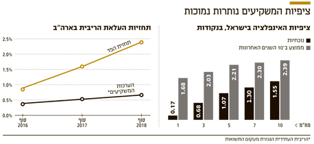 במידה שהירידה במפלס הפחד תימשך, סביר שהפוקוס יחזור לשני פערים שלהערכתנו מחייבים התייחסות: הפער בין התחזית המעודכנת שסיפק הפד לגבי גובה הריבית העתידית בארה"ב, לריבית הנגזרת מעקום התשואות בפועל, והפער בין ציפיות האינפלציה הנמוכות ליעד האינפלציה של הבנקים המרכזיים בארה"ב וישראל. התחזית המעודכנת של חברי הוועדה המוניטרית של הפד מדברת על ריבית של 0.9% בסוף השנה הנוכחית, 1.6% בסוף השנה הבאה ו־2.4% בסוף 2018. מספיק להתבונן על עקום התשואות האמריקאי כדי להבין שהמשקיעים ממש לא "קונים" את התחזית המעודכנת של הפד וכנראה שניתן להבין אותם נוכח העדכון העקבי כלפי מטה בתחזיות המסופקות מדי רבעון.