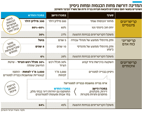 משקל הקריטריונים האיכותיים, שכוללים בין היתר את הניסיון של החברות בבנייה (מספר הפרויקטים שבנתה החברה, היקף הפרויקטים, וכו'), עלה מ־45% במכרז הישן ל־64% במכרז החדש; משקל הקריטריונים הפיננסיים, שכוללים בין היתר את מחזור ההכנסות השנתי של החברות ויחס החוב הפיננסי נטו למאזן, עלה מ־27% במכרז הישן ל־30% במכרז החדש; ומשקל הקריטריונים הקשורים בכוח אדם, שכוללים בין היתר את מספר שנות הוותק המינימלי הממוצע של מנהלי עבודה ומהנדסי ביצוע, צנח בחדות מ־28% במכרז הישן ל־6% בלבד במכרז החדש.