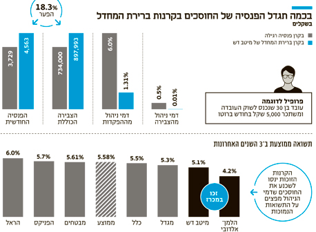 קרן הפנסיה של מיטב דש תגבה דמי ניהול בשיעור של 1.31% מההפקדות החודשיות ו־0.01% מהצבירה הכוללת. דמי הניהול שתגבה קרן הפנסיה של הלמן־אלדובי יעמדו על 1.49% מההפקדות החודשיות ו־0.001% מהצבירה הכוללת. לשם השוואה דמי הניהול המקסימליים המותרים על פי חוק הם 6% מההפקדות החודשיות ו־0.5% מהצבירה. דמי הניהול הממוצעים בתעשיית הפנסיה עומדים כיום על 0.25% מהצבירה הכוללת ו־2% מההפקדות החודשיות. באמצעות הרפורמה עובד בן 30 המשתכר 5,000 שקל ברוטו בחודש ושיפרוש בגיל 67 יוכל להגדיל את קצבתו החודשית ב־834 שקל מ־3,729 שקל ל־4,563 שקל.