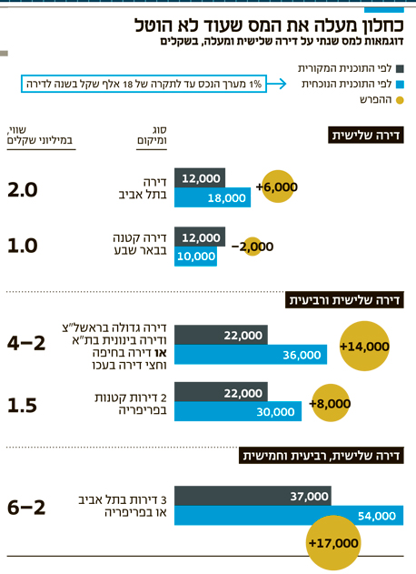 ההבדל היחיד בתוכנית המקורית הוא מספר הדירות, ולפיה מי שיש לו שלוש דירות ישלם מס בהיקף של 12 אלף שקל בשנה, מי שיש לו ארבע דירות ישלם מס בהיקף של 22 אלף שקל בשנה ומי שיש לו חמש דירות ישלם מס בהיקף של 37 אלף שקל בשנה.