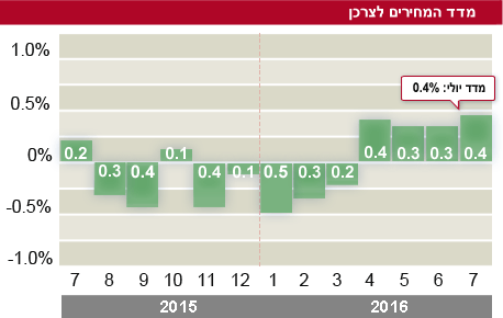 מדד חודש יולי עלה ב-0.4% - כך פרסמה הלשכה המרכזית לסטטיסטיקה. העלייה היא ב-0.2%-0.3% מעל הציפיות בשוק ההון. ב-12 החודשים האחרונים המדד עדיין שלילי, ברמה של 0.6%. ביוני עלה המדד ב-0.3%.