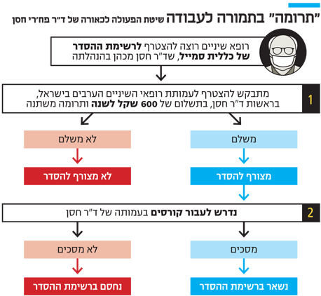 עיקר התלונות נגד ד"ר חסן, סגן הרופא הראשי בכללית סמייל (החל מ־2013, לפני כן שימש כיועץ החברה לענייני החברה הערבית), מתמקדות בדרישתו לכאורה מרופאי שיניים מהמגזר הערבי להצטרף לעמותת רופאי השיניים הערבים בישראל, שבראשה הוא עומד מאז 2012. כמו כן הוא דרש מהם לשלם בעבור החברות 600 שקל בשנה ותרומות נוספות בסכומים משתנים ולעבור קורסים רק דרך העמותה — כתנאי להכללת מרפאותיהם ברשימות ההסדר של כללית סמייל. מרפאות הסדר הן קליניקות