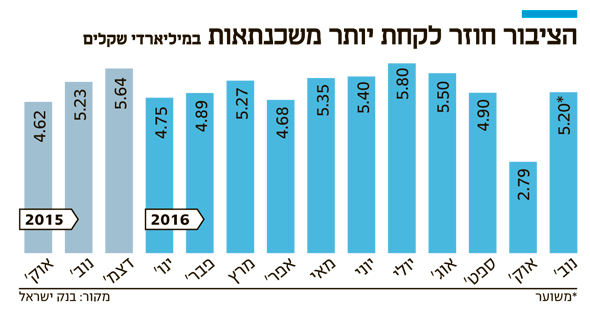 מספר המשכנתאות שנטל הציבור בנובמבר צפויות להכפיל את עצמן מהחודש הקודם, ולהגיע לסכום של 5.2 מיליארד שקל, על פי ההערכות במערכת הבנקאית. קצב נטילת המשכנאות זהה בהשוואה לחודש המקביל אשתקד.