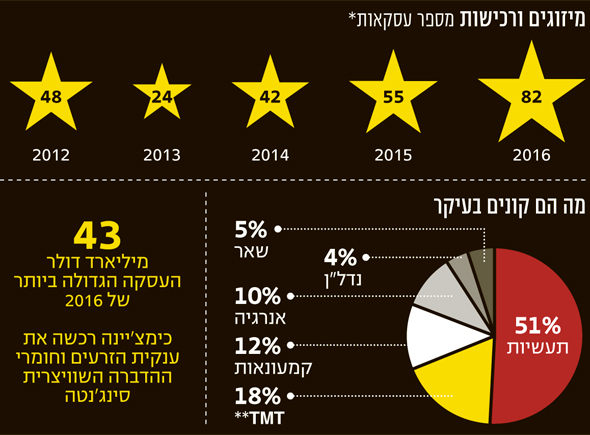 לפי נתוני משרד הסחר הסיני, היקף הרכישות שמבצעות חברות סיניות בעולם הגיע לסכום של 146 מיליארד דולר בעשרת החודשים הראשונים של 2016 ועקף את השיא של 2015 שעמד על 121 מיליארד דולר. המיזוגים והרכישות הגלובליים של 2016 כוללים את עסקת הענק שבמסגרתה רכשה כימצ'יינה את סינג'נטה ב־43 מיליארד דולר.