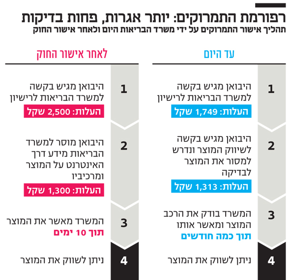 יבואני הקוסמטיקה, כמו גם בענפים אחרים, נדרשים כיום לתשלומים גבוהים עבור בדיקות שעוברים המוצרים המיובאים. עבור כל מוצר שמשווק בישראל משלמים היבואנים למדינה אגרת רישוי בגובה 1,300 שקל, שאותה הם דורשים לבטל כעת בעקבות הרפורמה, שכן זו קובעת כי היבואן לא יצטרך לקבל עוד את אישור משרד הבריאות, וממילא לא להמתין מספר חודשים, על מנת לשווק מוצר בישראל. כל שיידרש זה להודיע למשרד באמצעות האינטרנט על כך שהוא מייבא את המוצר לארץ, ובכך גם מסיר עצמו משרד הבריאות מהאחריות על איכות המוצר והאחריות תוטל במלואה על היבואן.