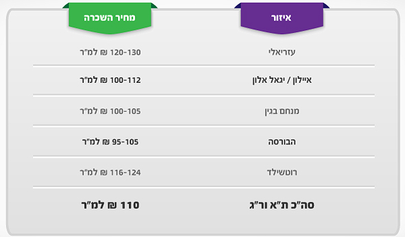 עלות ממוצעת למשרדים במגדלים בתל אביב הינה 15 אל"ש למ"ר. שכר הדירה המתקבל בממוצע הינו 110 ₪ למ"ר. כלומר, סה"כ תשואה כ- 8%-10%. שיעורי תשואה כמעט פי שלוש מאשר שיעורי התשואה מדירות מגורים.
