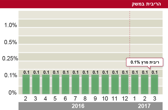 בנק ישראל השאיר את הריבית במשק לחודש מרץ על 0.1%, כך הודיעה היום (ב') הוועדה המוניטרית של הבנק, בראשות הנגידה קרנית פלוג. מדובר בחודש ה-25 בו הריבית נותרת על שיעור זה.