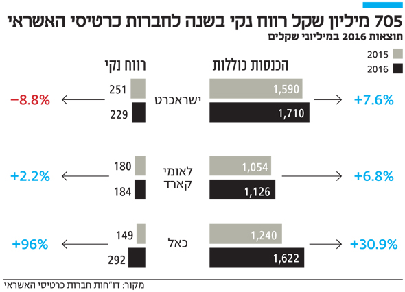 אל כל אלו מתווסף החוק שמתעצב בימים אלו להסדרת שוק ההלוואות של צרכנים לצרכנים (P2P) שעשוי לקבוע כללי משחק חדשים לענף ולהוות אלטרנטיבה מפוקחת לחברות כרטיסי האשראי מבחינת גובה הריבית. "כלכליסט" ממפה את המגמות המרכזיות כפי שהן עולות מהדו"חות השנתיים של שלושת חברות כרטיסי האשראי, את האתגרים העומדים בפני חברות אלו בשוק המשתנה ואת המשמעויות עבור הצרכן שעלולות להיתרגם לעלייה בשיעורי הריבית על ההלוואות.